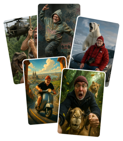 Mini- & Mid-Movies: In nur 20–30 Sekunden erschaffen wir kleine filmische Kunstwerke, die Aufmerksamkeit fesseln und Emotionen wecken. Foto-Revivals: Wir retten verblasste Erinnerungen, machen alte Fotos wieder strahlend und vergrößern sie ohne Qualitätsverlust. Fun-Pics: Lust auf ein Bild, das viral gehen könnte? Als Superheld, im Mittelalter, als Anime-Charakter oder im galaktischen Space-Setting – wir machen’s möglich! Jeder Auftrag ist ein kleines Kreativprojekt, das verblüfft, begeistert und perfekt für Social Media geeignet ist. Du lieferst die Idee – wir die Magie.